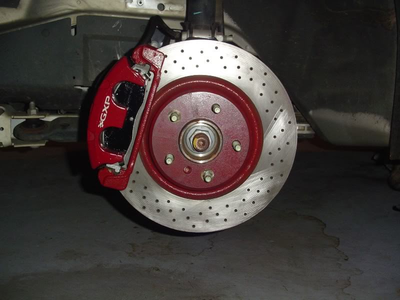 Here are some more pictures of the front brackets and rotors, the rear calipers and rotors installed and with the wheels on. They went on using the GTP brake line, but not recommended, and all GTP bolts. Just ordered some new GXP lines at the local dealership, $73.00. I have a friend who can get me some Braided stainless steel lines made if you want, either for the GT/GTP or the GXP! The only thing that sucks is that now I have no E-brake!!!! Those of you that may not know,