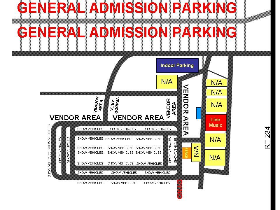 Attachment 217 Here is how we are planning to have it setup the day of the show.... Attachment 218 All of the dark lines are paved roads for driving to the show parking area. The show parking are is packed gravel with grass growing through it with no mud or dirt areas. The way we have set it up is you will drive on the pavement right up to the parking spot. You will then back on to the packed gravel/grass mix just off the pavement. For the people not showing their vehicles, the general admission parking is just like the gravel parking at MIR. This will not be a mud fest because I would not park my car there if it was and I would not expect anyone else to. Plus think about it, you are parking on the same ground they set up 30 to 40 thousand pound carnival rides on. Please click on the following link for directions to the Prince William County Fairgrounds.... Driving Directions -Ryan |