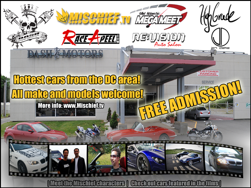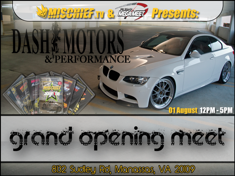 Attachment 159 Mischief.tv and the Mid Atlantic MEGA MEET invite you to attend the DASH Motors & Performance Grand Opening Meet on Sunday, August 1, 2010 from 12-5 pm. DASH Motors & Performance has been in business since 1998 and recently purchased the Saturn of Manassas Dealership (8132 Sudley Road, Manassas, VA 20109) in order to expand. They are a one stop car shop dealing with everything from buying/selling used vehicles to building a ride that will turn heads. So come check out some of the hottest rides that the Mid Atlantic Region has to offer along with the Mischief characters and cars that have been featured in the films. There will also be import models from DASH Models Inc. posing for pictures by the official photographer HighGrade, DJ Jon Deke & LJ MTX performing, and food vendors so bring the entire family. Admission is free and we ask that only modified cars park on the dealership property. There is plenty of parking at the surrounding businesses for normal vehicles and recommend showing up really early in order to get a good parking spot. Make sure you mark this on your calendar and don't forget the Mid Atlantic MEGA MEET slogan: Cars, Trucks, Bikes, People, All Colors, All Styles...You bring the fun! If you have any questions, please visit www.Mischief.tv or send an email to dustin@Mischief.tv, dashperformance@gmail.com, or info@megameet.org. -Ryan |