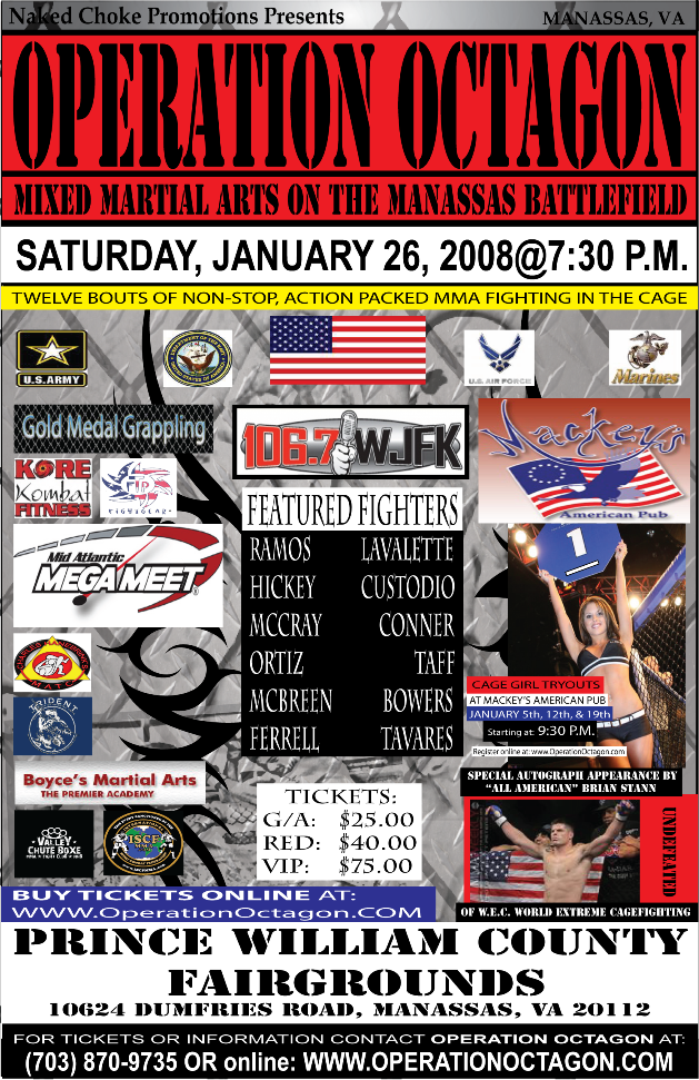 "When fighters dream, they dream of the octagon. This is one stop on the road to their dream." Who: Some of the best, up and coming Mixed Martial Arts (MMA) fighters in the Metro area. What: Twelve, non-stop action packed bouts of MMA fighting in the cage officially sanctioned by the ISCF (www.iscfmma.com) Where: Prince William County Fairgrounds located at 10624 Dumfries Road Manasssas, Virginia 20112 (http://www.megameet.org/?pg=next) When: Saturday, January 26, 2008 - doors open at 6:30pm, fights begin at 7:30pm For tickets or more information, please contact Naked Choke Promotions at (703) 870-9735 or online at www.operationoctagon.com. The Mid Atlantic MEGA MEET Management fully supports this event and will be in attendance (www.megameet.org) -Ryan |
